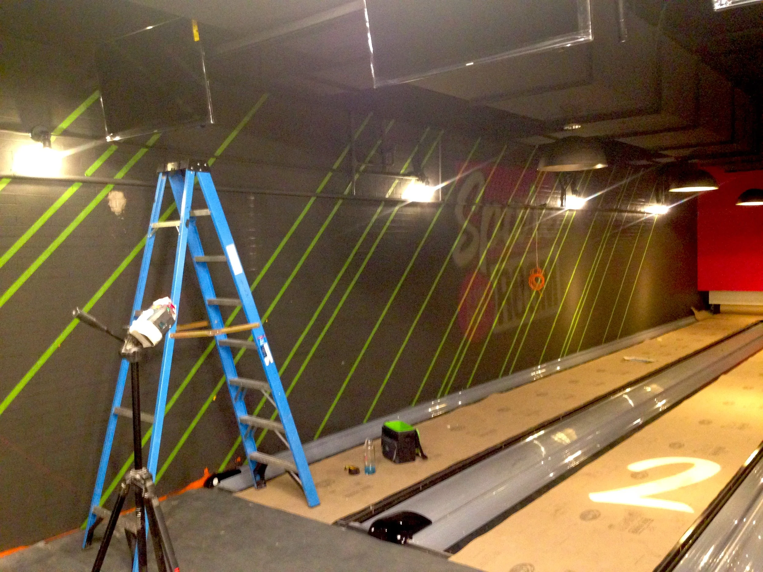 Subcontracted to paint a bowling alley in the basement of the aLoft hotel in Buffalo. Worked from a blueprint provided by the client.